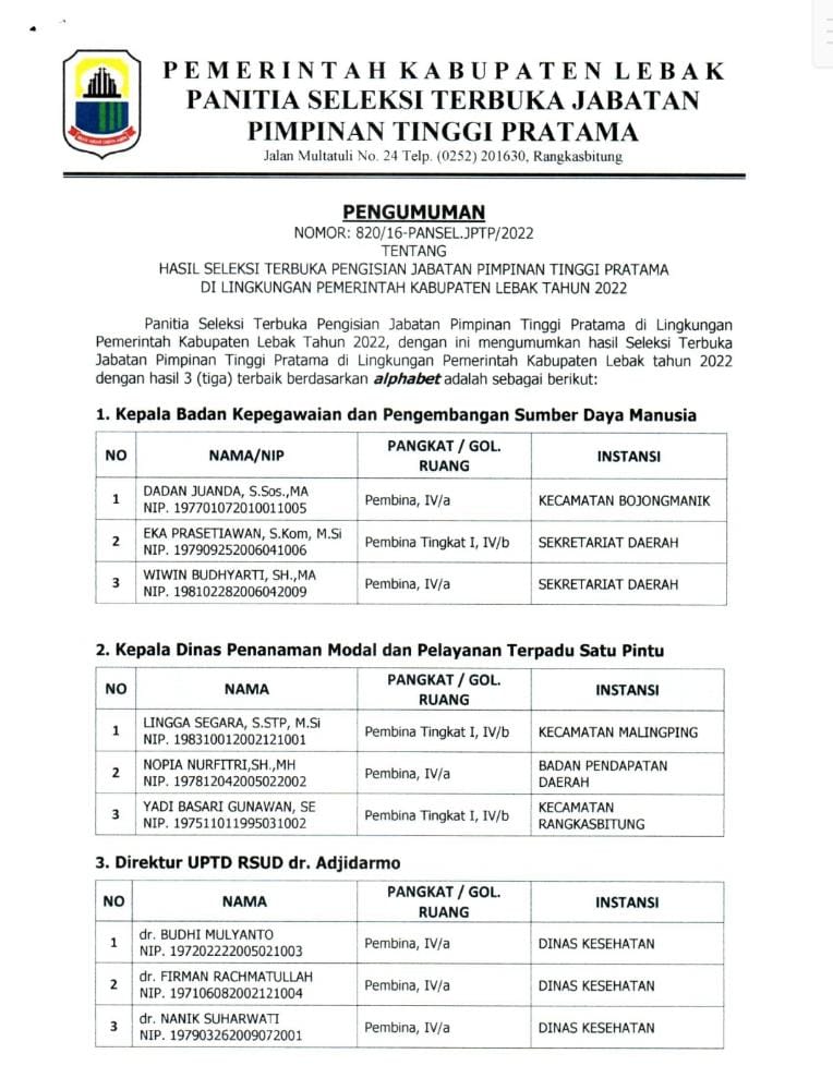LEBAK, ORBITBANTEN.CO.ID – Pemerintah Kabupaten (Pemkab) Lebak melalui Badan Kepegawaian dan Pengembangan Sumber Daya Manusia (BKPSDM) Kabupaten Lebak telah mengumumkan 3 nama besar pejabat Pemkab Lebak yang lolos dalam seleksi Open Biding.